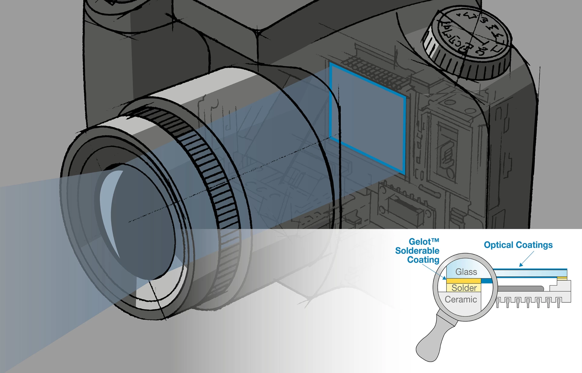 CMOS or CCD sensor devices as applied in machine vision application or in optical consumer products require an effective protection of the light sensitive chip area by a transparent cover glass. Soldering is the assembly technology which provides best hermeticity values of such packagings. Gelot™ solderable coating gives the glass a surface which is well adhesive to solders such as gold or palladium. Gelot™ is applied to the lid in shape of a frame with a clear aperture. A customer-specific cutting-edge low defect coating can be added to the clear aperture, e.g. in the form of a high transmission bandpass filter for the visible spectral range combined with a broad NIR blocking.