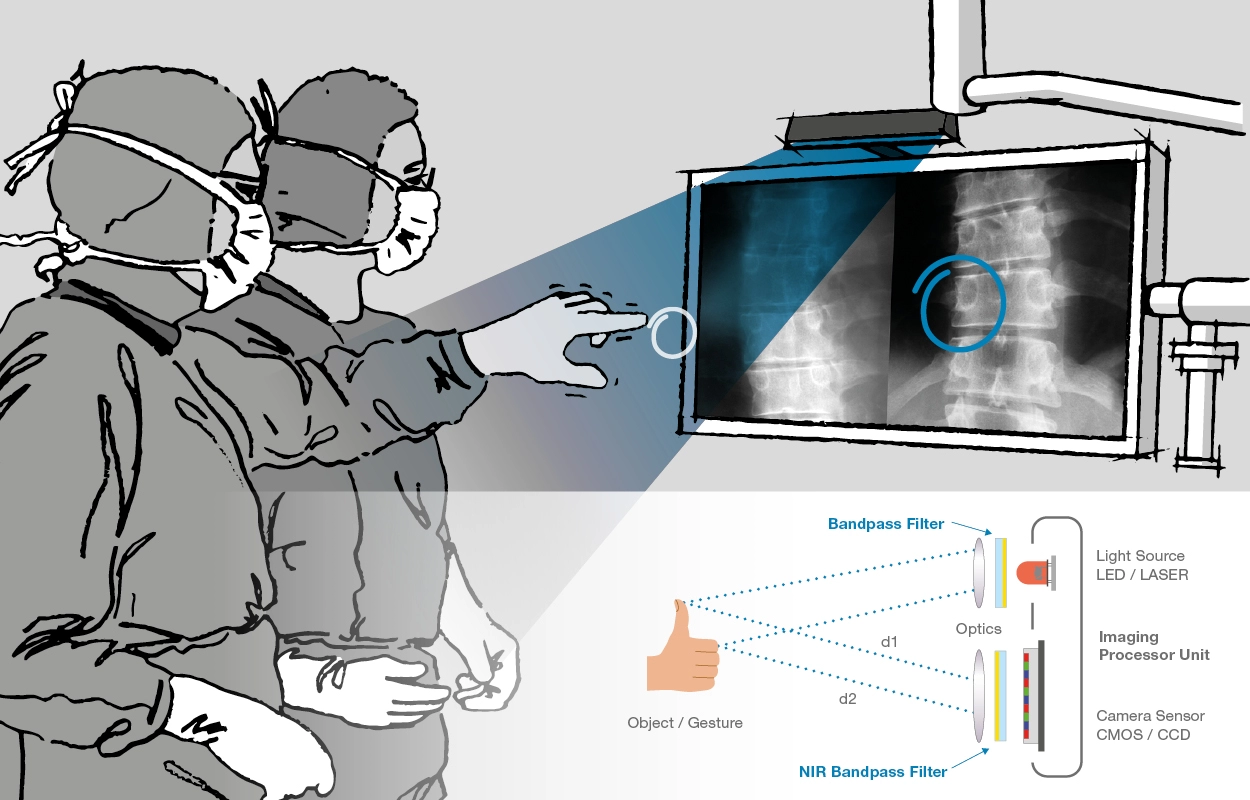 For reliable gesture recognition, maximum spectral contrast must be achieved by specific optical filter elements. Therefore, maximum transmission in the range of the illumination wavelength (Laser or LED source) for a wide field of view is required. Additionally, the transition between the high transmission pass region and the directly adjacent deep blocking region is generally required to be extraordinarily steep to precisely select exclusively the illumination wavelength for detection. Filters sizes and spectral requirements can be customized and combined with B-stage epoxy or Gelot™ solderable coating frames for optional sealing and protection of the sensor.
