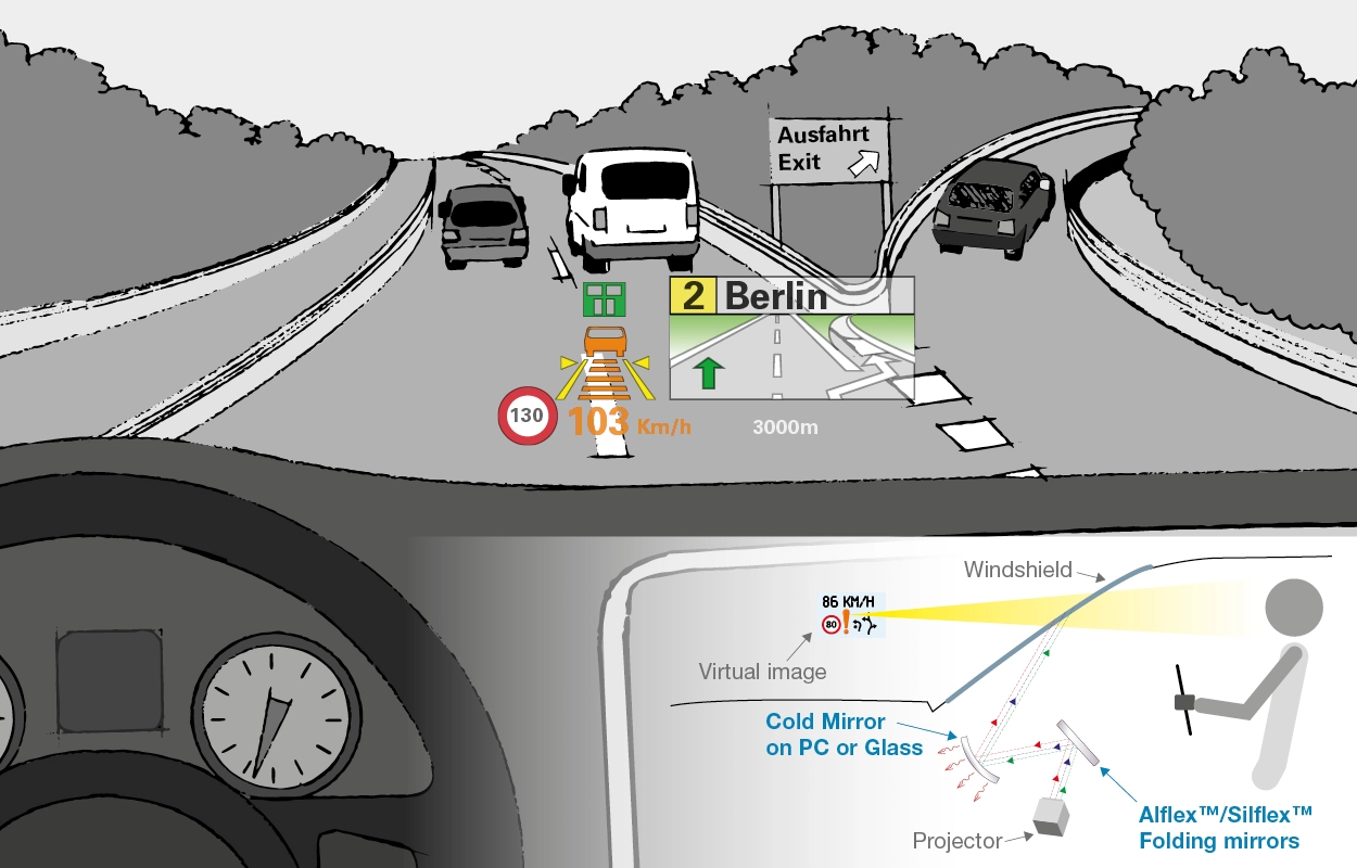 As HMI (human machine interface), the windshield head-up display plays a special role in the Automotive segment. The driver can read relevant information off the windshield without looking away from the traffic situation. An efficient mirror system has to project this information from the PGU (picture-generating unit) into the driver’s field of vision in neutral colors and without any distortions and light losses. As one stop shop, Materion Balzers Optics offers all the necessary coated optical component: environmentally stable, color-neutral and high-reflectivity metallic and dielectric image-steering mirrors with optional AR coatings.