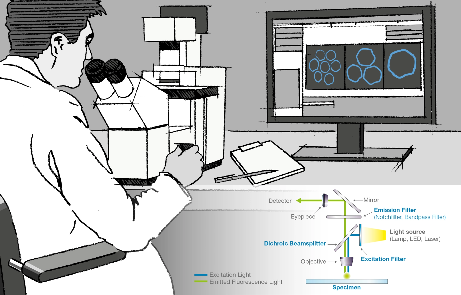 Fluorescence Microscopy utilizes light of specific wavelength to excite (excitation) fluorophores bound to biological samples, to emit (emission) light at longer wavelength for analysis. Materion Balzers Optics fluorescence filter sets enable this interaction and include excitation filters, emission filters (bandpass, shortpass or longpass) and dichroic beamsplitters. Cut-on and cut-off wavelengths of the filters are optimized for the excitation wavelength and the fluorescent dye. The filter performance is realized by all-dielectric hard coatings deposited onto a single substrate. Since absorbing glasses and filter mounts are not needed, there is high flexibility for the filter dimensions in compact optical set-ups.