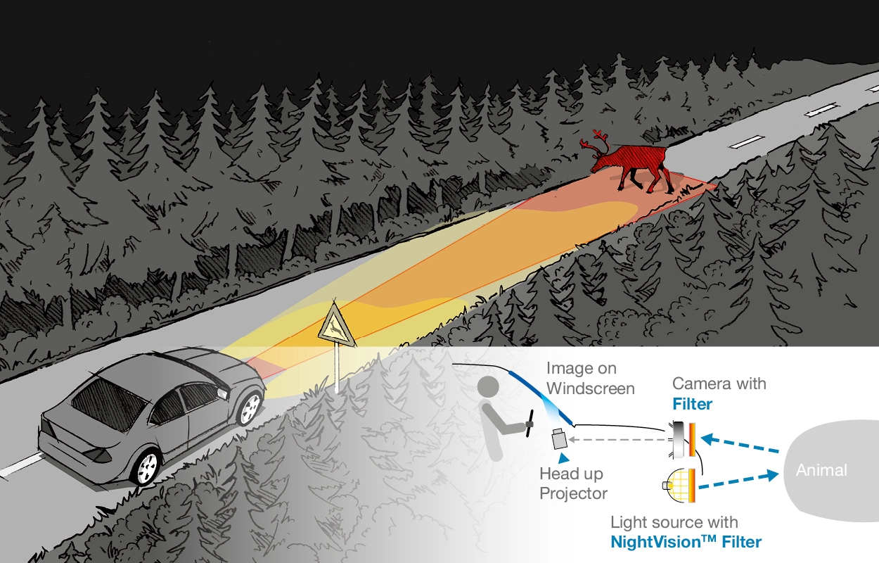 In darkness or difficult light conditions, night vision assistance systems help the driver to see persons, objects and the course of the road at a full beam distance without dazzling oncoming traffic. The infrared radiation registered by a camera is projected onto a display or a head-up display as grayscale image. Creating an image with as much contrast as possible and fulfilling ECE regulations in the headlight area poses major challenges for the light infrared management. Materion Balzers Optics night vision filters reduce the undesirable wave length ranges by a factor of more than 1000 and significantly contribute to compliance with the ECE regulations.