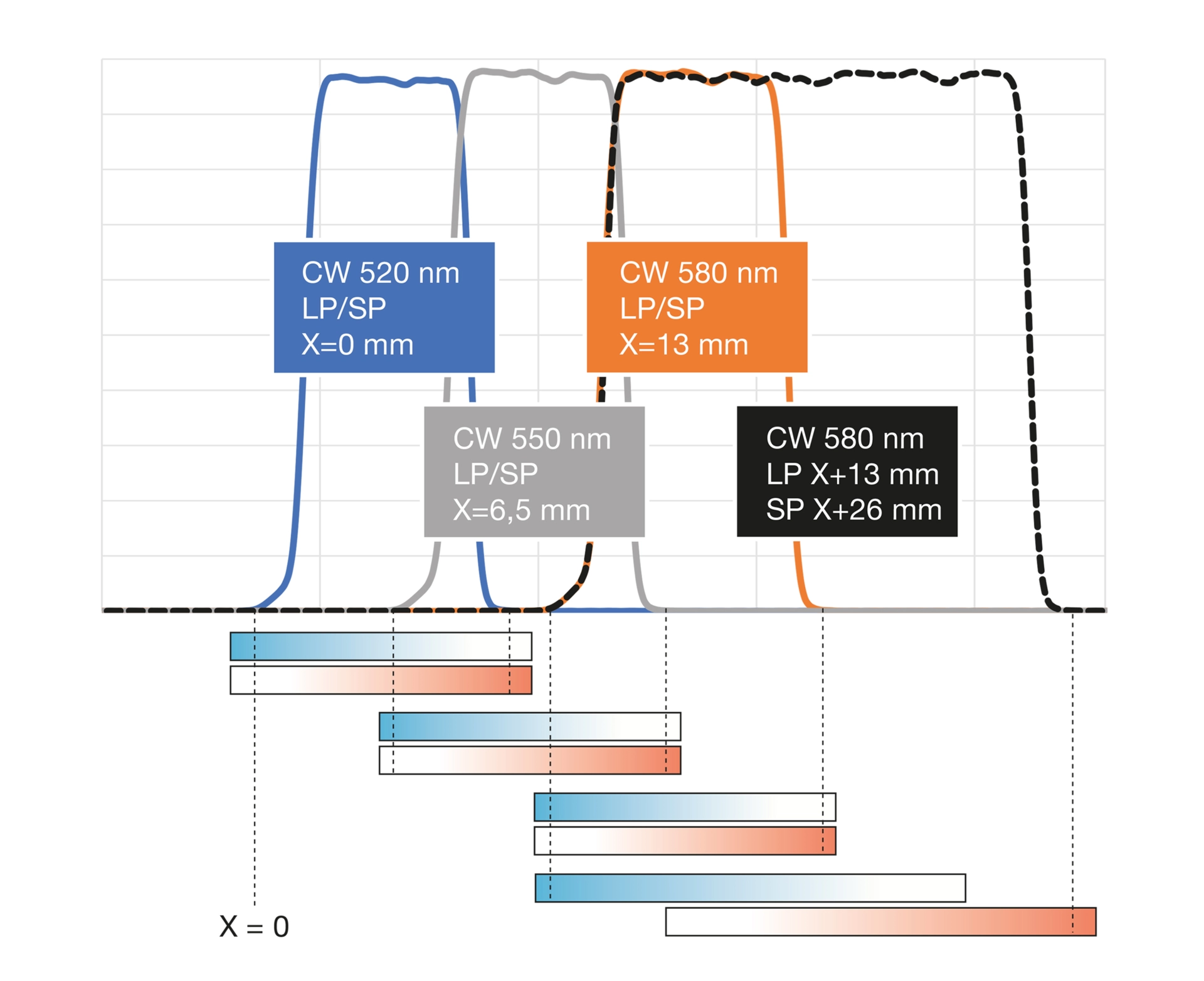 The combination of only two filters to form a bandpass filter that can be adjusted and tuned as desired represents an inexpensive alternative to buying a large number of individual filters. LVF therefore appears to be the method of choice for diagnostic systems that require a particular degree of flexibility.