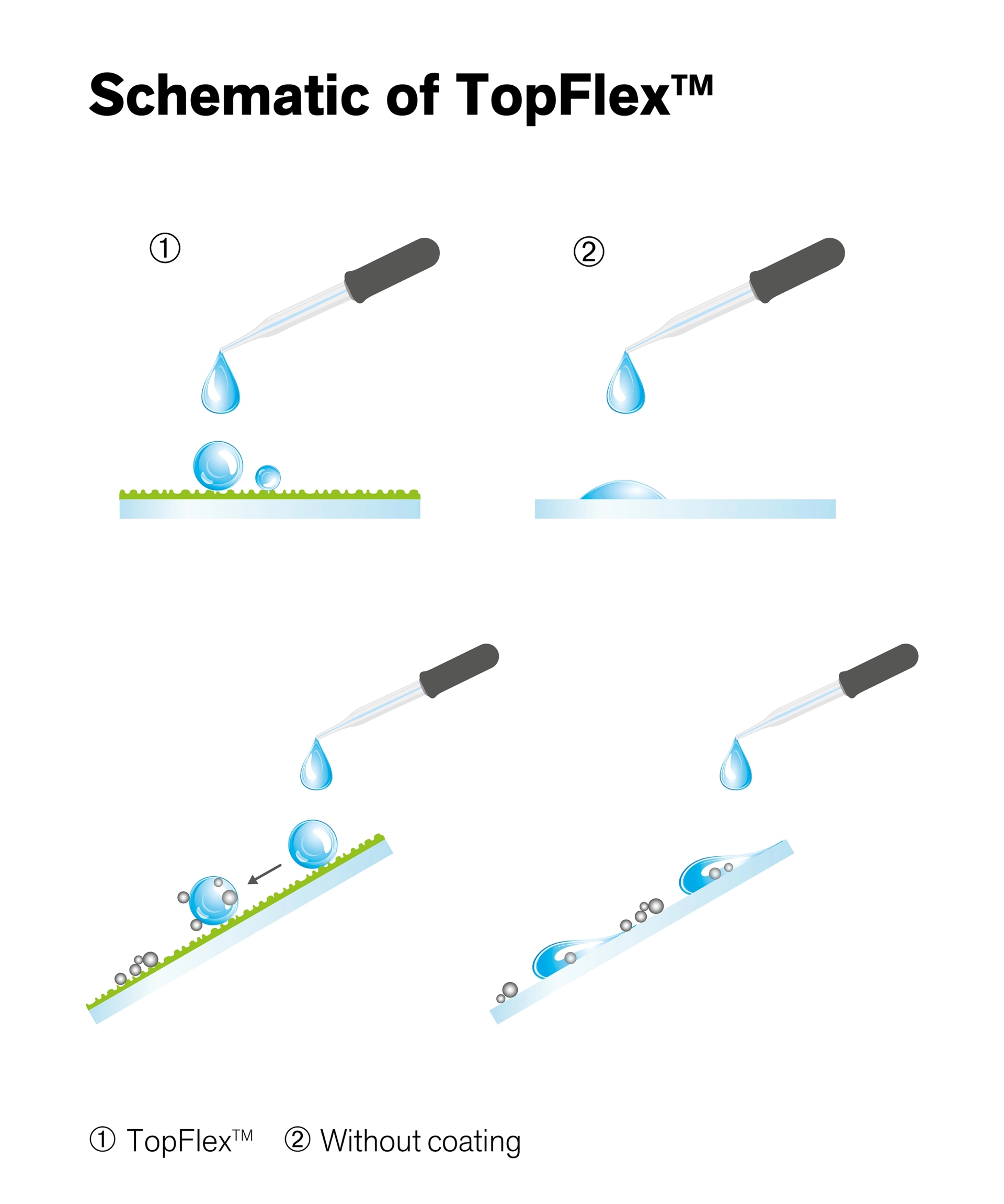 In order to provide users the greatest possible safety, Optics Balzers offers two new hydrophobic TopFlex™ coatings. Both are chemically resistant to water, oil and grease. TopFlex™ A and TopFlex™ UV are easy to clean and dirt repellent. Both adhere extremely well to underlying coatings such as anti-reflective coatings, mirrors or various filters. The new TopFlex™Coatings are largely insensitive to the most diverse cleaning processes and form an optimal, dirt-repellent and easy to clean top coating. TopFlex™ can be easily deposited on any combination of optical coatings. This results in a wide range of applications from the automotive industry, to heating windows, sensors, optical systems, endoscopy, diagnostics and research.