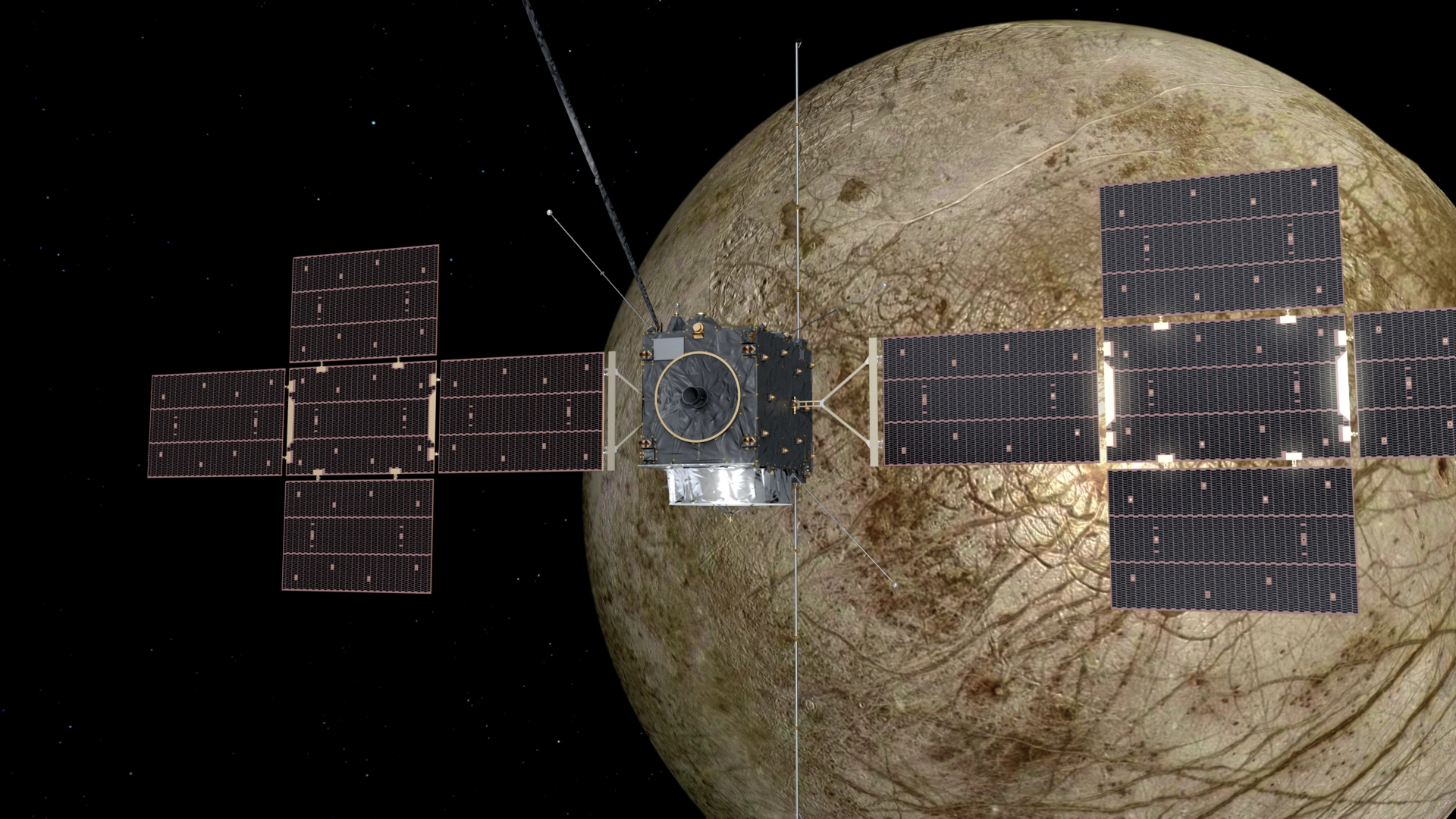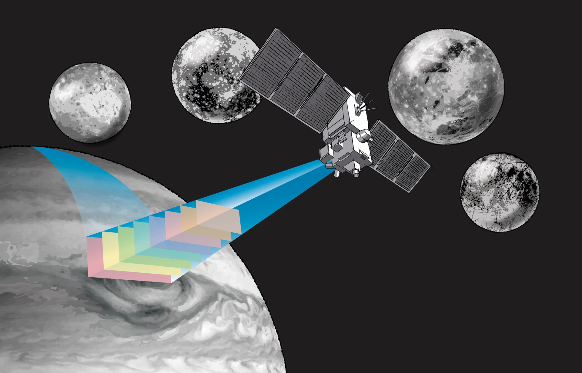 An external monitoring camera is part of the spacecraft to control the condition of the satellite and the acquisition of wide-angle images of the Jovian system during its journey. To allow color images, Materion Balzers Optics has applied four different color filters directly onto the 18 µm x 18 µm pixels of the electronic sensor by means of photolithography. Especially the high load of cosmic radiation is a critical parameter for the external monitoring camera. To ensure the functionality under harsh space conditions, all optical components need to pass various environmental tests before integration into the spacecraft.