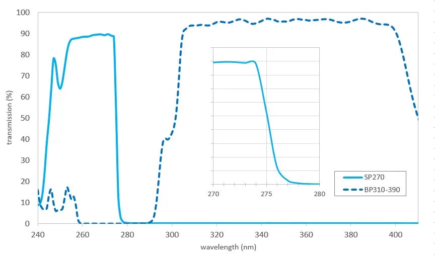 The fluorophoric substances stimulated by UV radiation emit long-wave signals above 275nm. The BP310-390 long-pass filter used here enables the detection of these emitted signals. The BP310-390 filter shown in the image below has an average transmission of > 95% for signal detection, within the range of 330nm to 390nm.