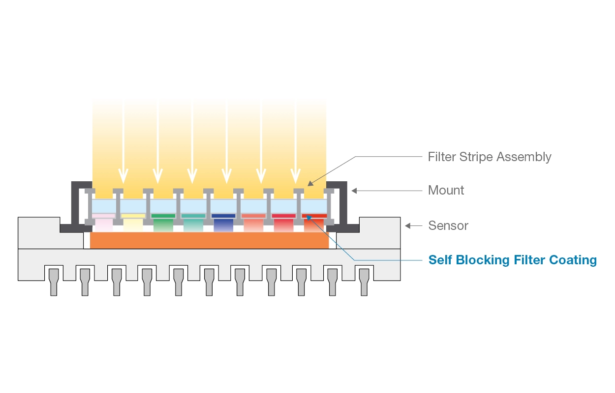 SWIR bandpass filters with standard or self-blocking filter design for spectral sensing and imaging combine wide blocking and high passband transmittance in a single all-dielectric interference coating. They feature extreme stability in terrestrial and space environments and are customized for Si, InGaAs or HgCdTe sensor applications.