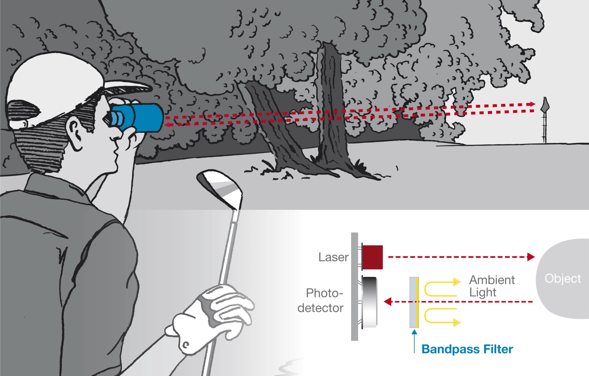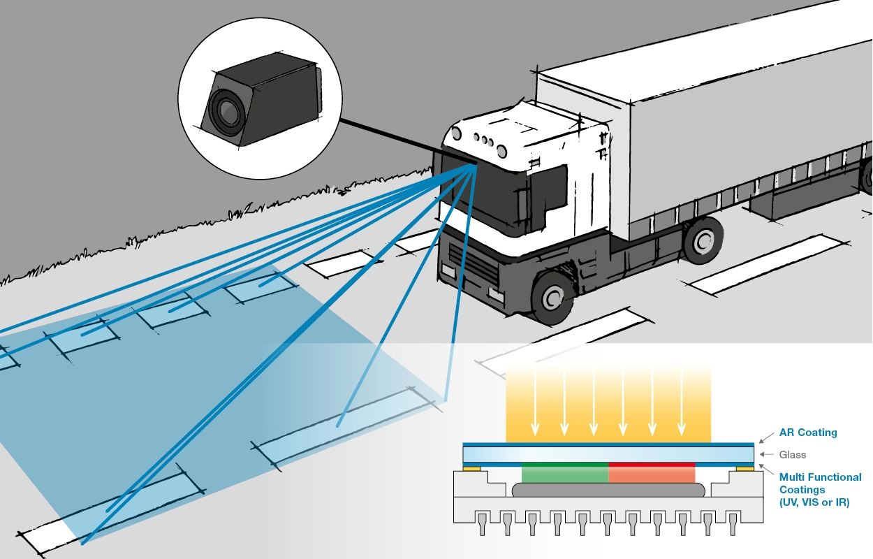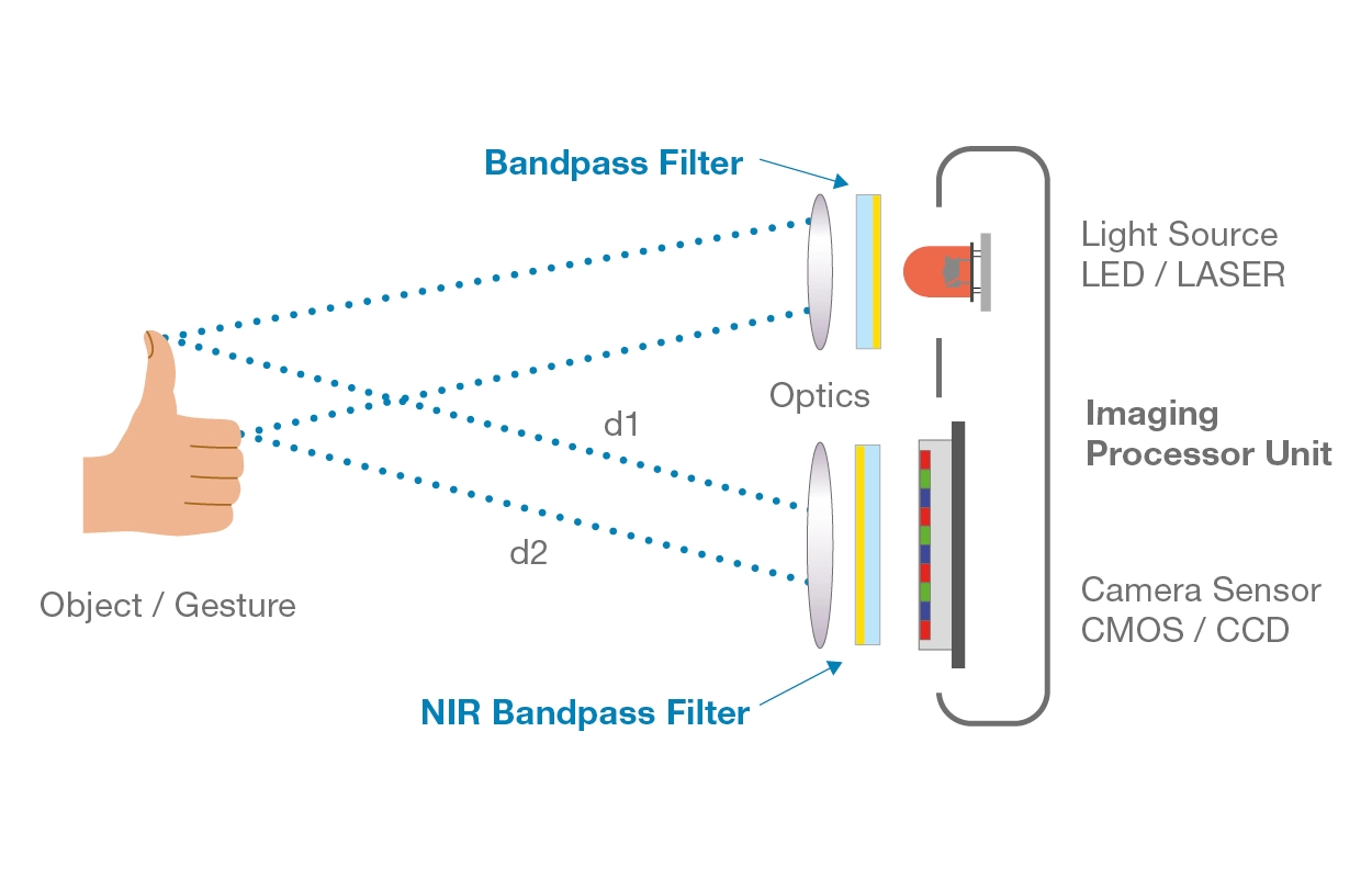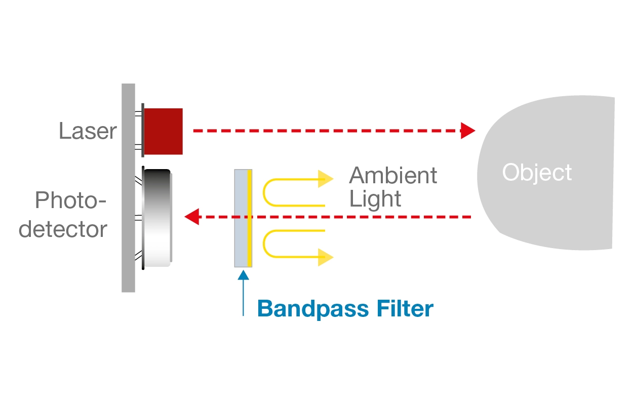 NIR bandpass filters SP are used in various optical sensor applications. They block the visible ambient light on one hand and the long-wave infrared light on the other hand. Only the selected signal or measuring light from the near infrared (NIR) range may be transmitted. NIR bandpass filters SP are therefore key components in achieving excellent signal-to-noise ratios, which are relevant for optical measurements, distance measurement applications, or specific systems for gesture recognition (TOF, Time-of-Flight). These characteristics facilitate either precise distance measurement with a lower signal light intensity or measurements with increased sensitivity and higher precision at normal signal light intensity.